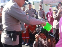usai memberikan sambutannya, Kapolres tampak menyirami para personel yang naik pangkat dengan air yang bunga sebagai salah satu rangkaian prosesi kenaikan pangkat bagi anggota Polri.